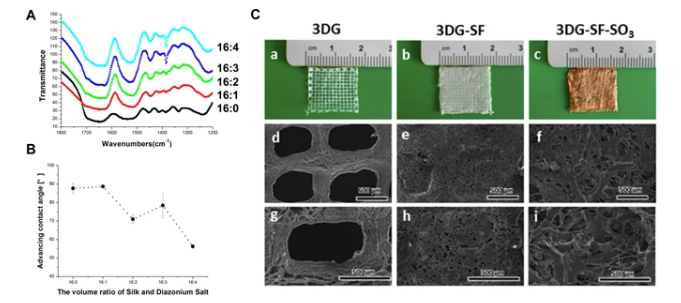 支架的表征。(A)未改性和磺化丝的ATR-FTIR光谱比较。(B)每16卷丝绸以0、1、2、3和4体积推进原生SF和SF衍生物的接触角。(C) 3D打印支架(3DG)、SF涂层3D打印支架(3DG-SF)和SF衍生物涂层3D打印支架(3DG-SF-SO3)的显微照片