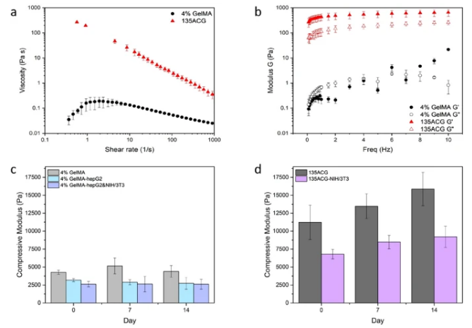 丝素蛋白是天然聚合物,具有良好的生物相容性、其卓越的机械性能、环境稳定性和非炎症反应,作为支架可用作修复皮肤、骨、软骨、韧带和肌腱、血管、神经、气管和膀胱组织。研究小组利用PanoSpace BioPro 3D 生物打印机,通过普通生物打印头,软件中导入常规模型作为打印支架,利用PanoSpace BioPro 3D 生物打印机多都联动的打印方式,将明胶装入料筒装入普通打印头中,气动挤出打印方式,打印基本构架,在通过另一个装有丝素蛋白的普通生物打印头进行表面覆盖或填充,为纯明胶支架提供了增强的机械支撑。在确认复合材料在体外相对较低的细胞毒性后,我们进一步研究了其在体内应用的优势。高度协调和重叠的凝血(止血)、再上皮化(迁移和增殖)和重塑(成熟)过程的复杂级联自然发生在皮肤损伤后。伤口肉芽形成是皮肤愈合的重要阶段,是迁移和增殖阶段的关键部分。在明胶降解后,SF 网提供微尺度多孔结构,随后通过引导柱状组织通过网生长并填充伤口以恢复功能,从而促进伤口肉芽化。